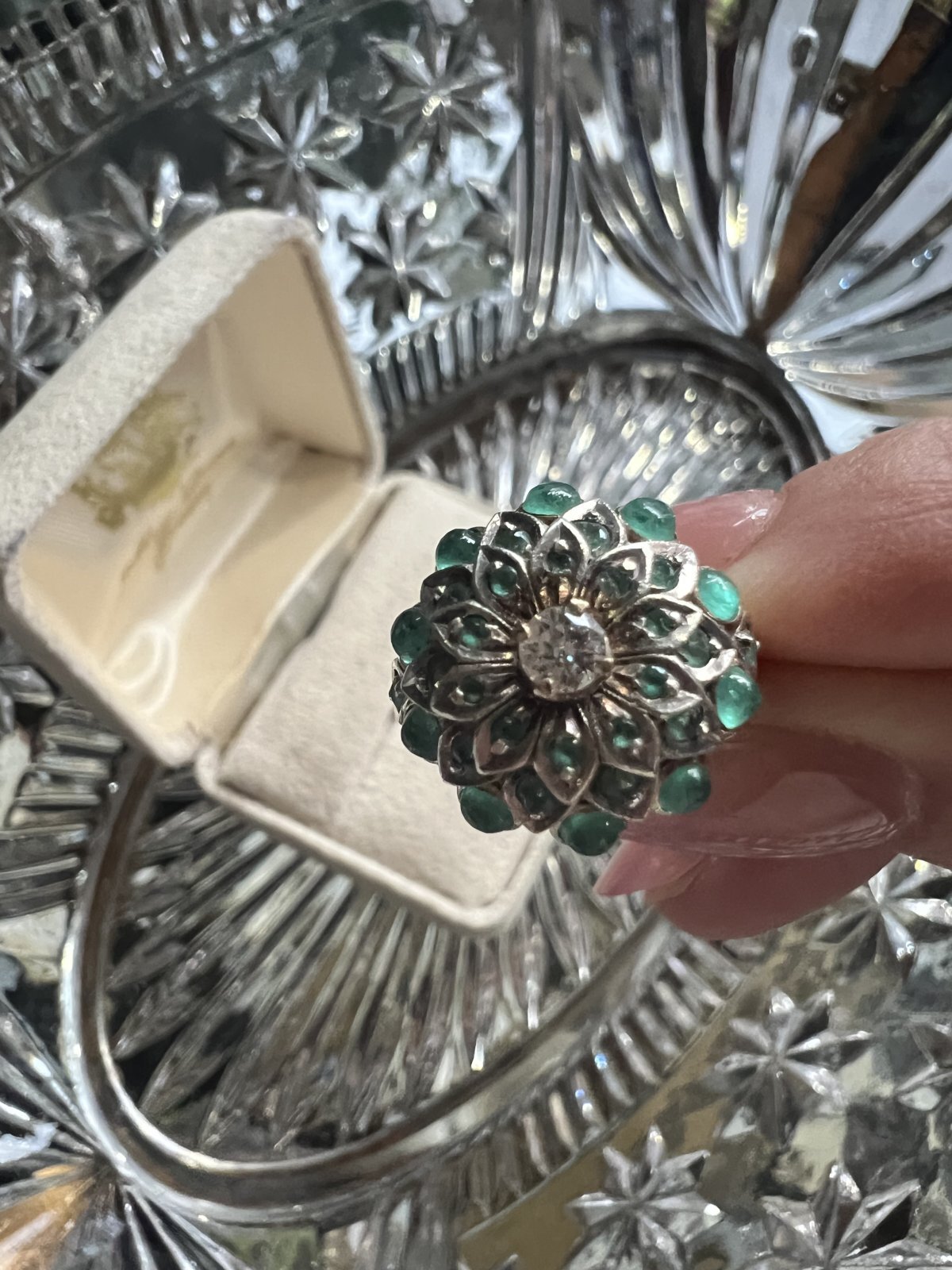 1920年代アール・デコのデザインで、全体のドーム型の花弁一枚一枚にカボションされたエメラルドが埋まっており、中央には美しいダイヤモンド。
