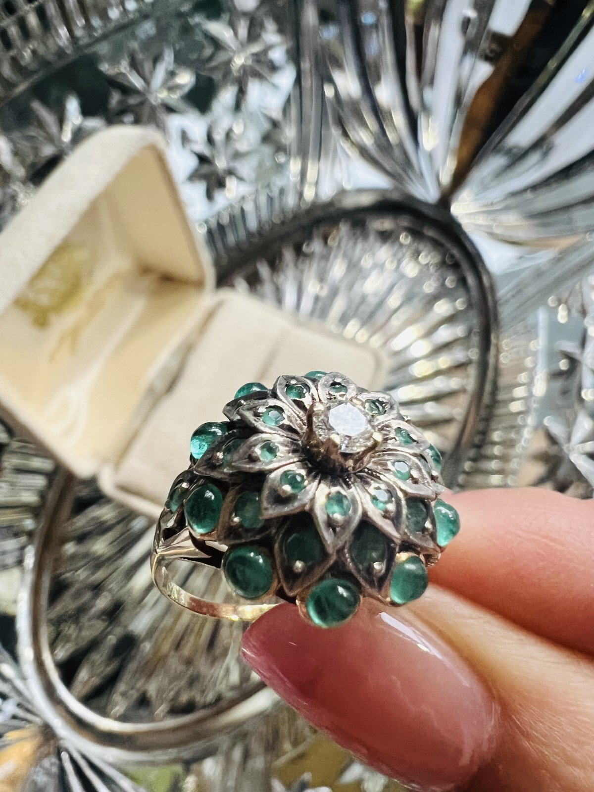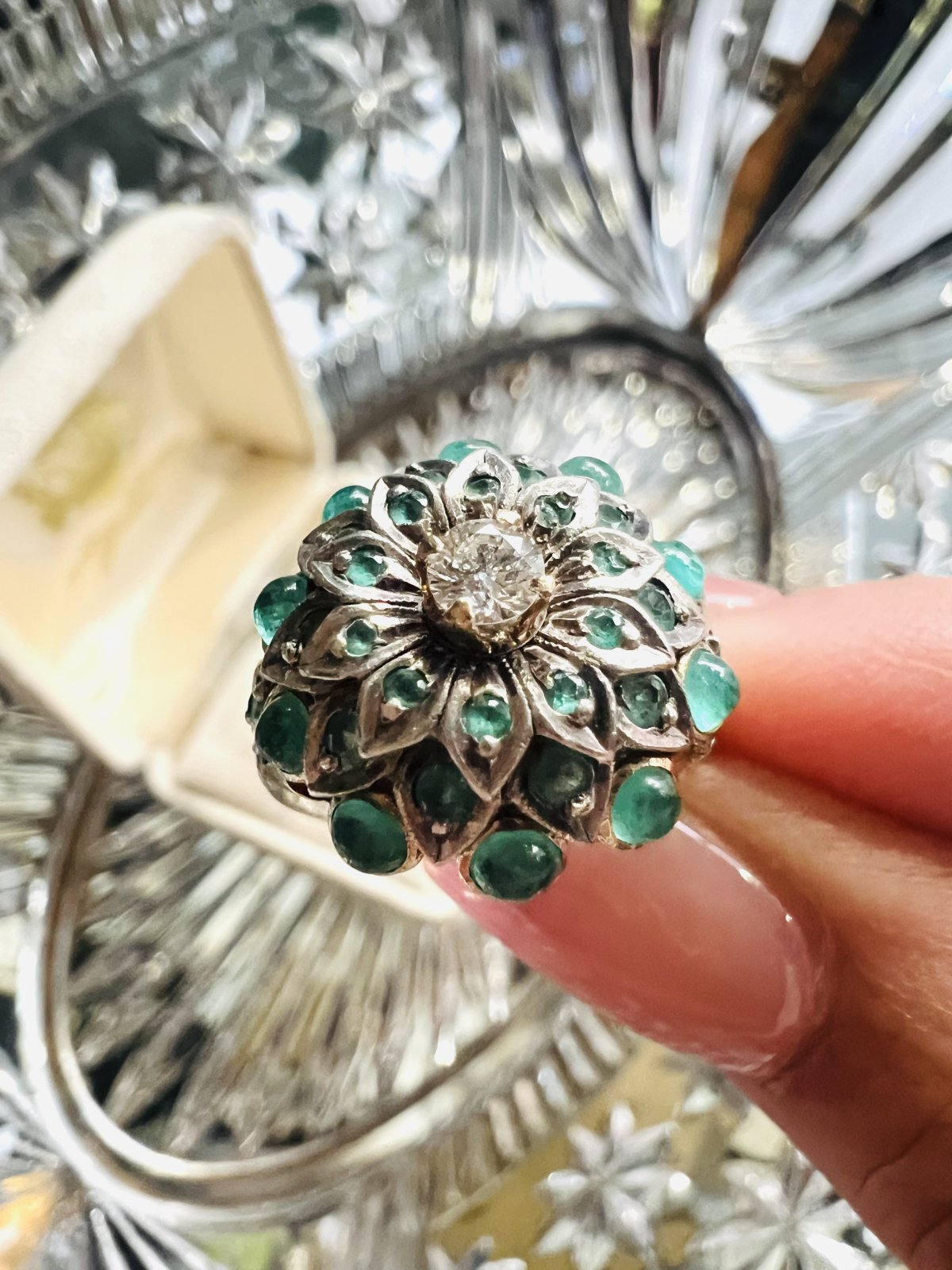 サイズ・Size :中央のダイヤモンド 0.25ct、カボションのエメラルド 22粒〜