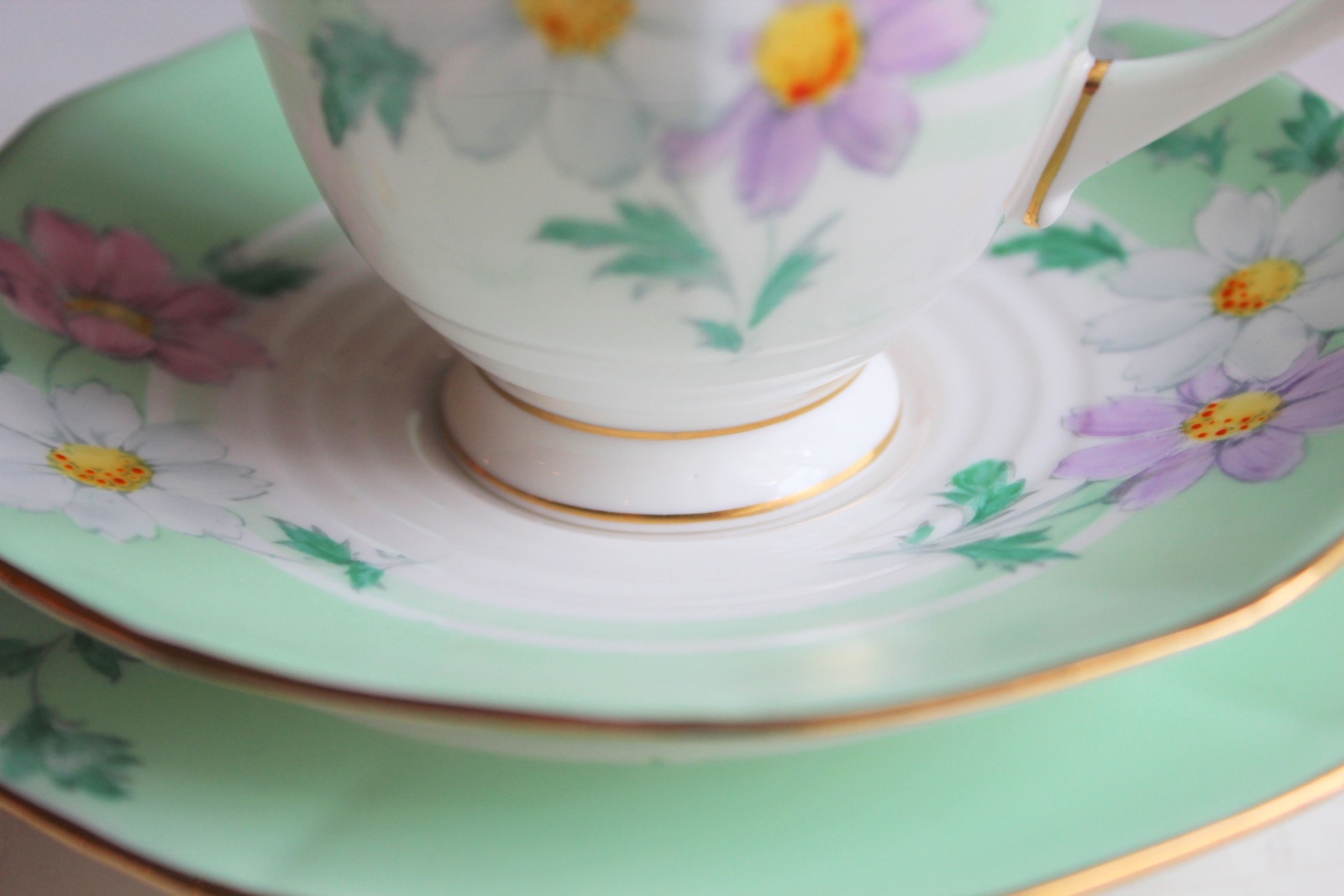 淡いグリーンに マーガレットが優しく咲き、ティータイムのテーブルを明るく演出。