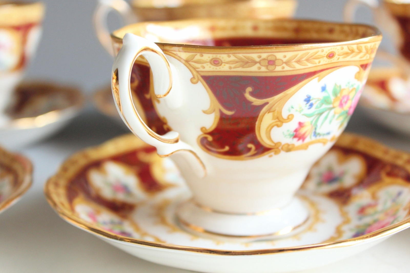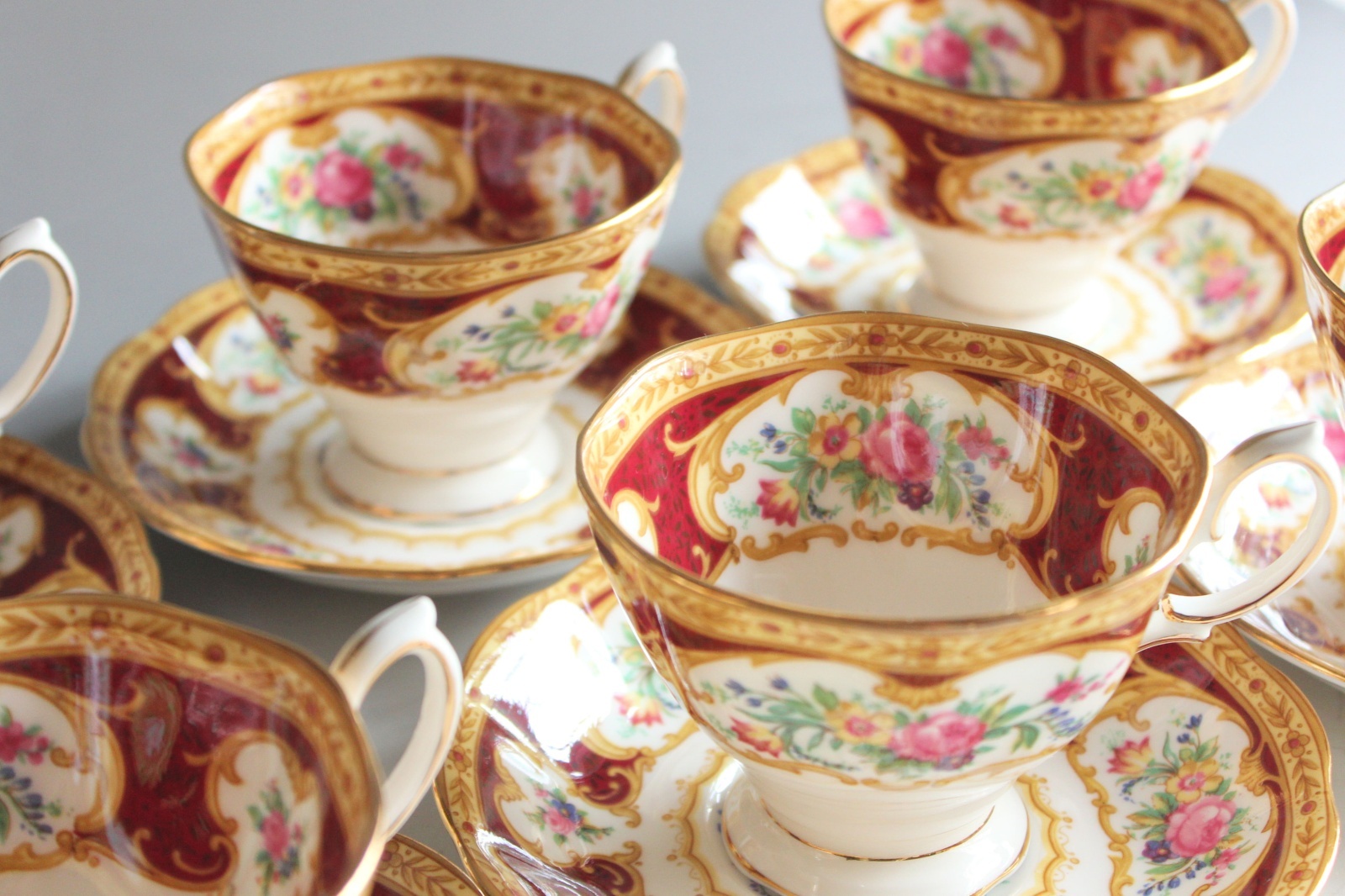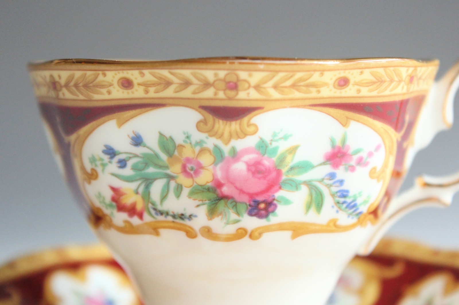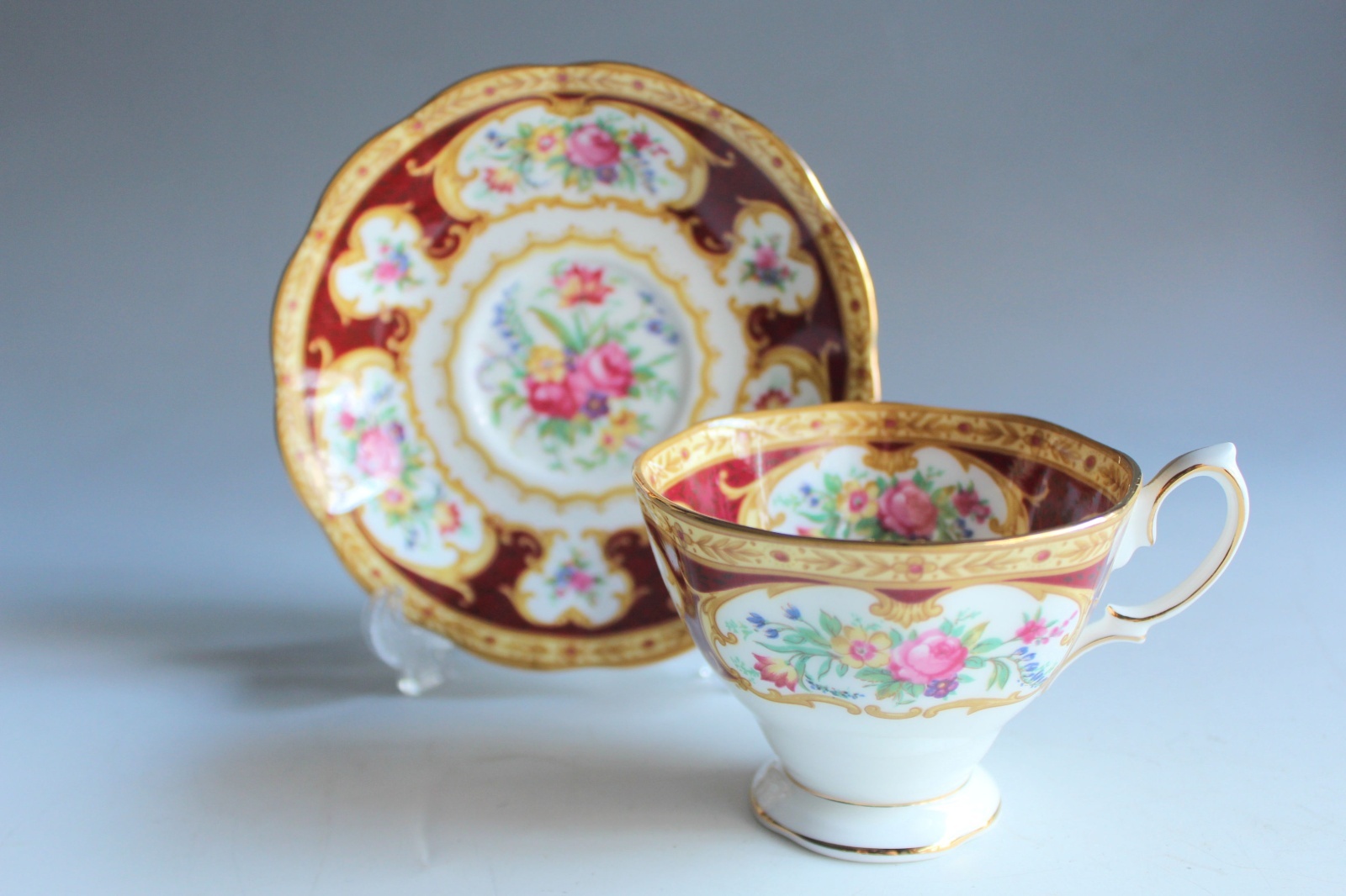 落ち着いた 深みのある赤(ボルドーカラー)に、鮮やかなブーケが美しい、ロイヤルアルバートのカップ&ソーサーが届きました。
