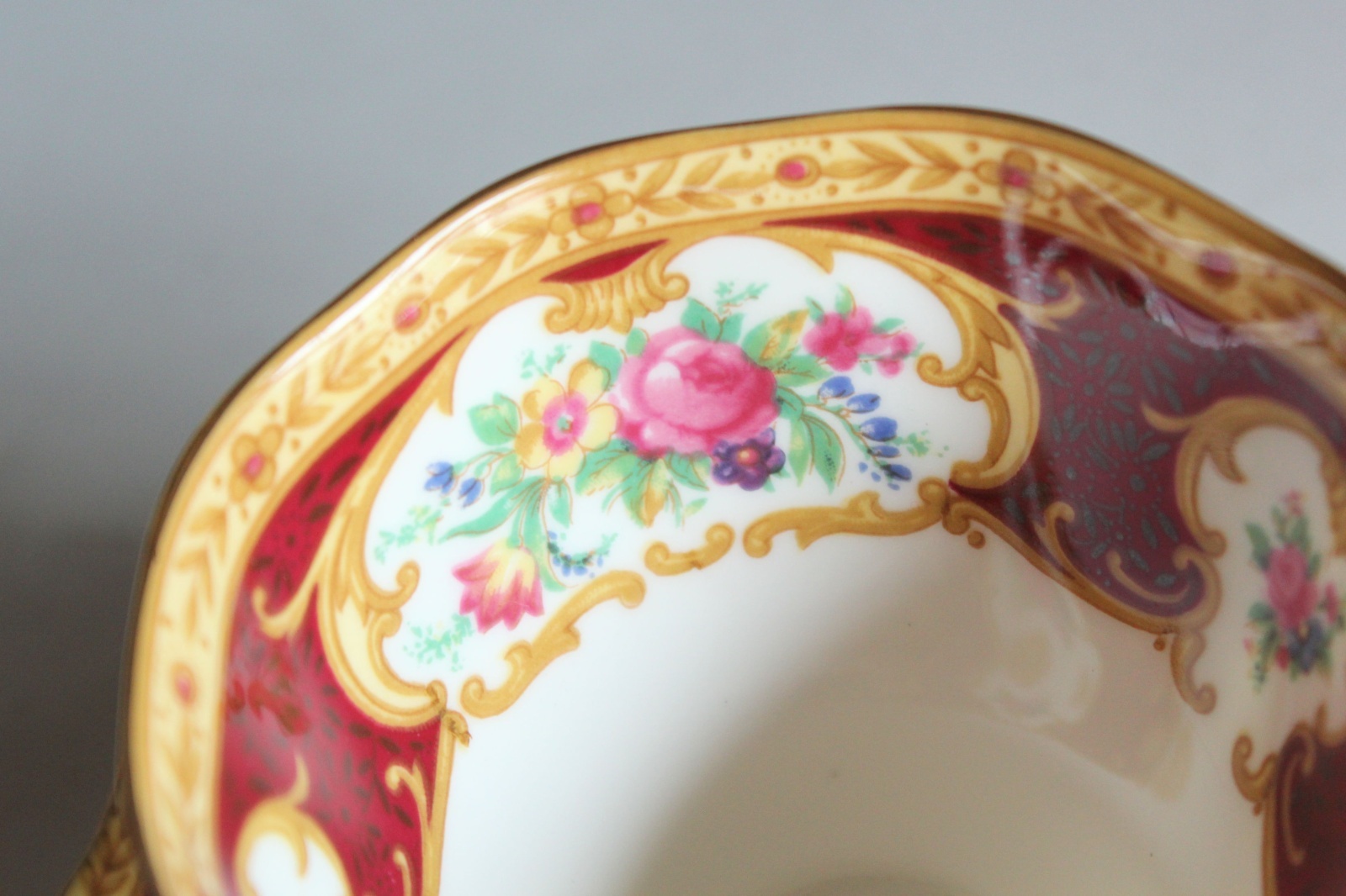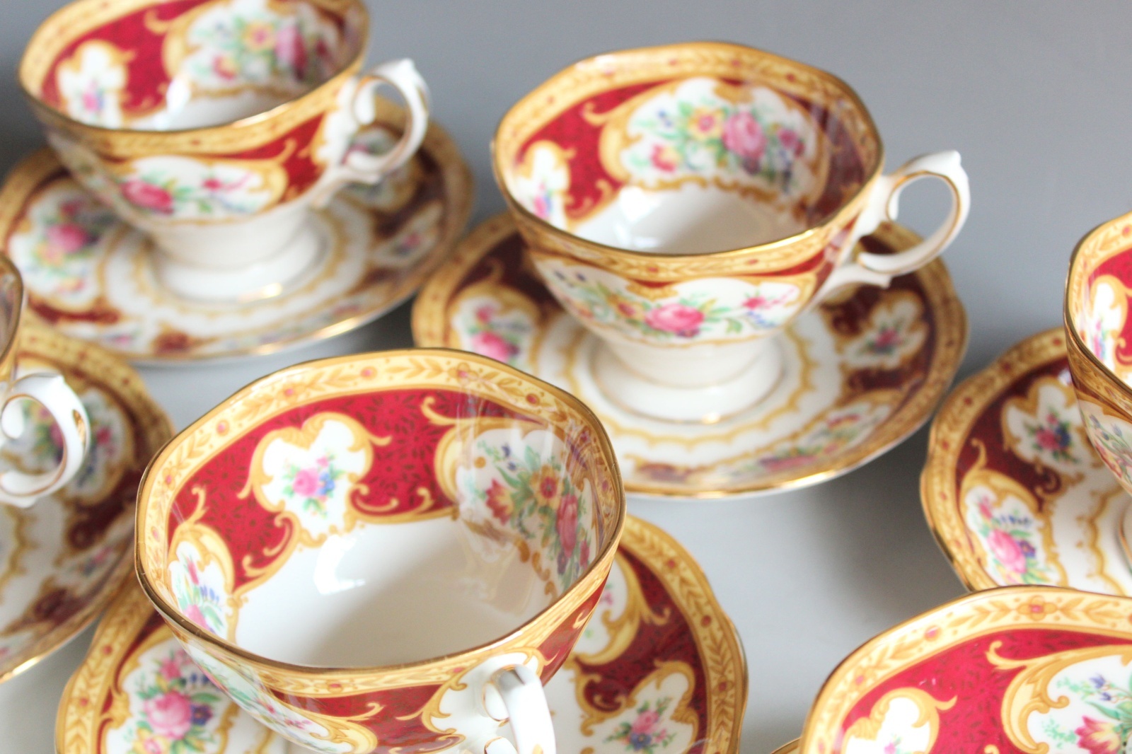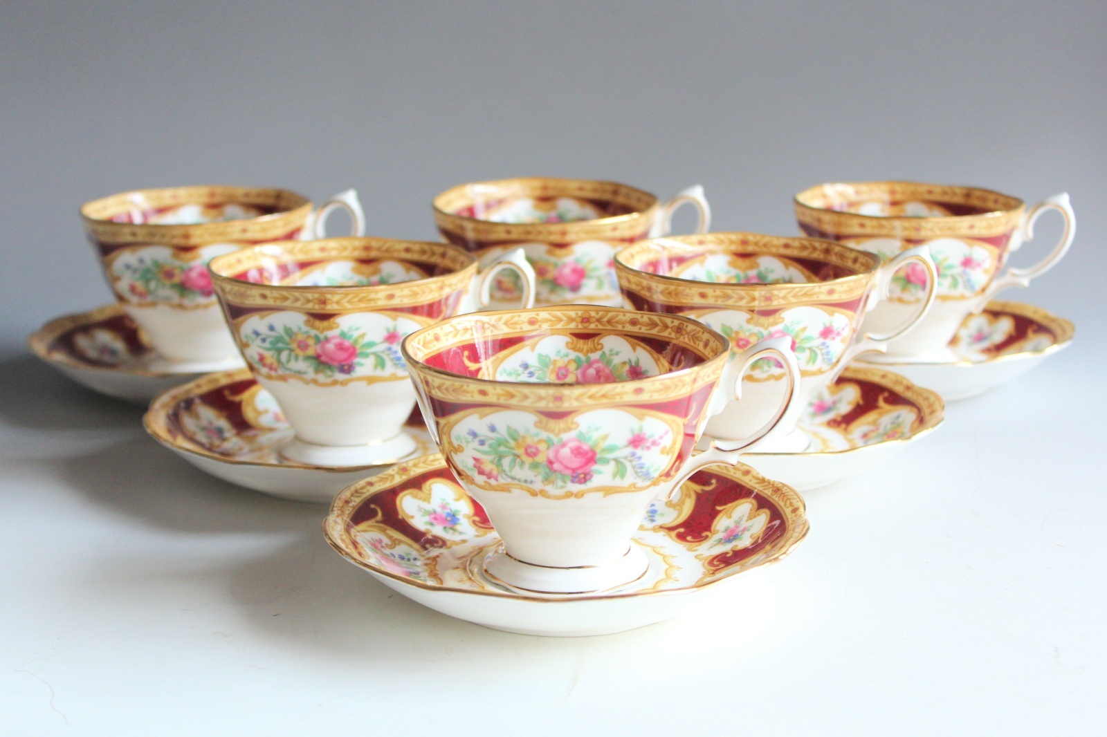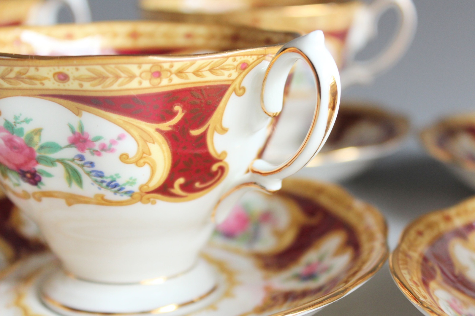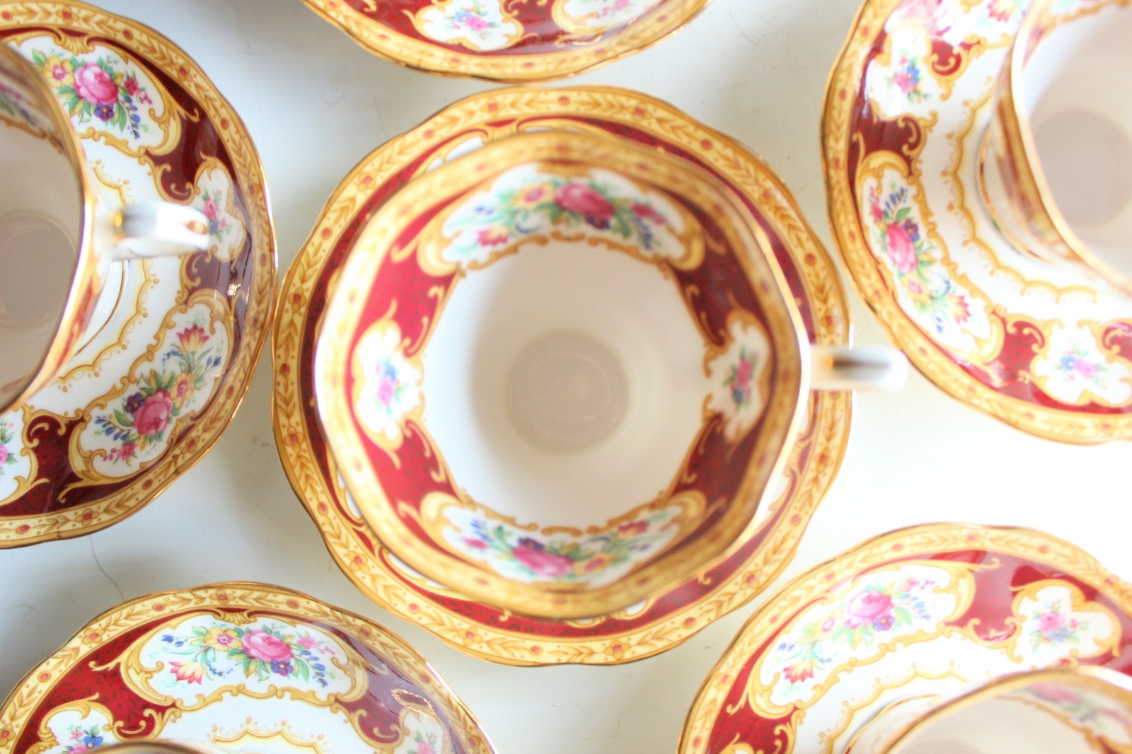 落ち着いた 深みのある赤(ボルドーカラー)に、鮮やかなブーケが美しい、ロイヤルアルバートのカップ&ソーサーが届きました。