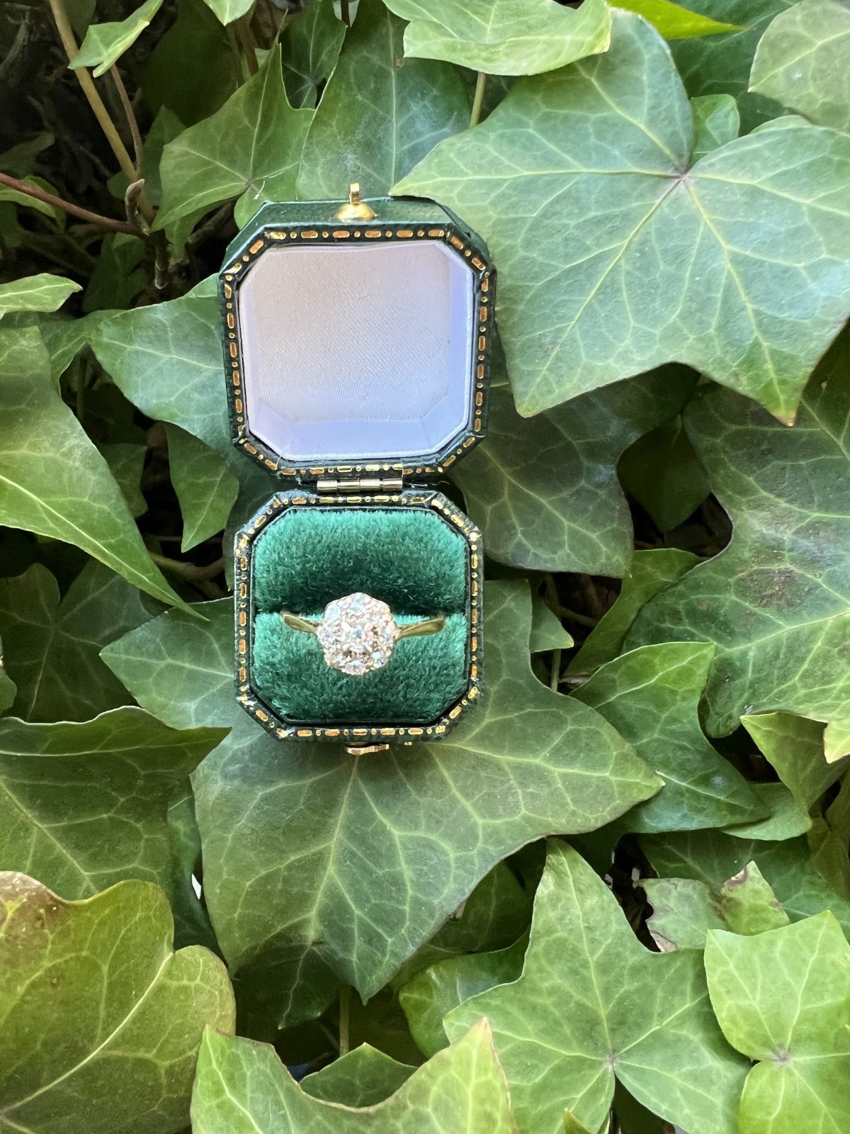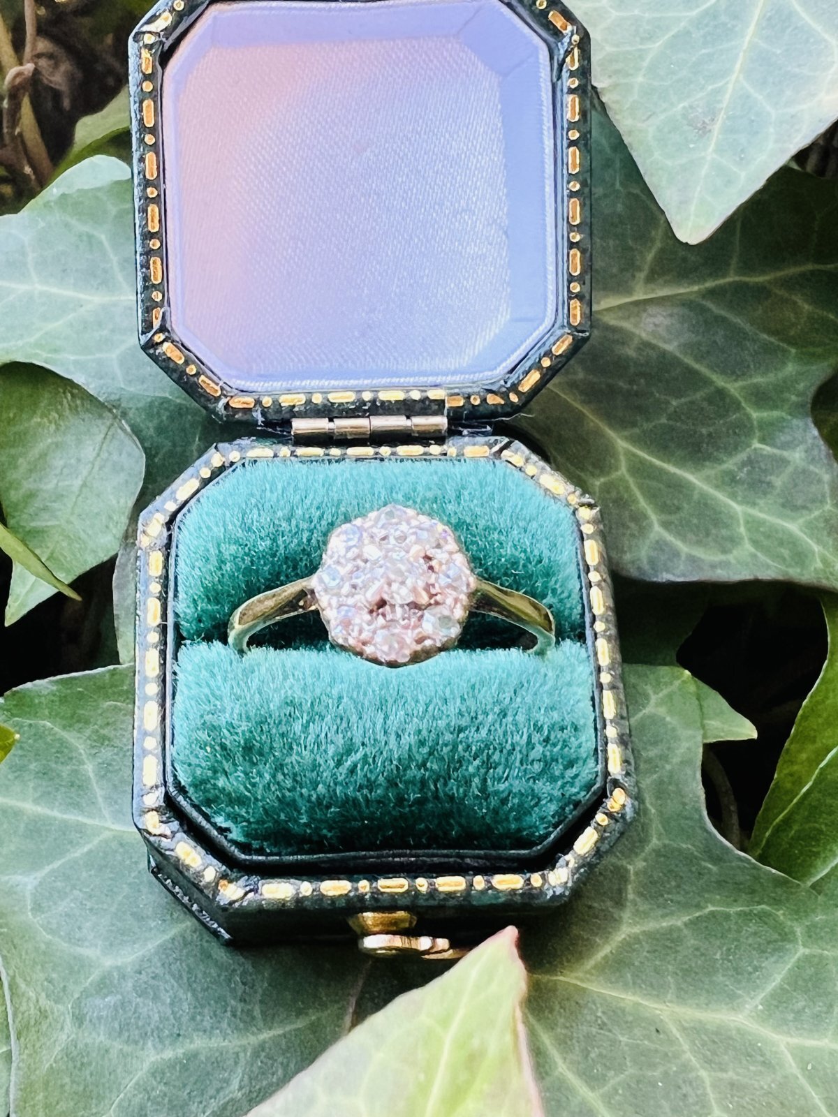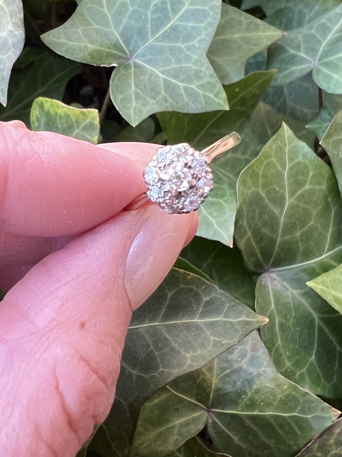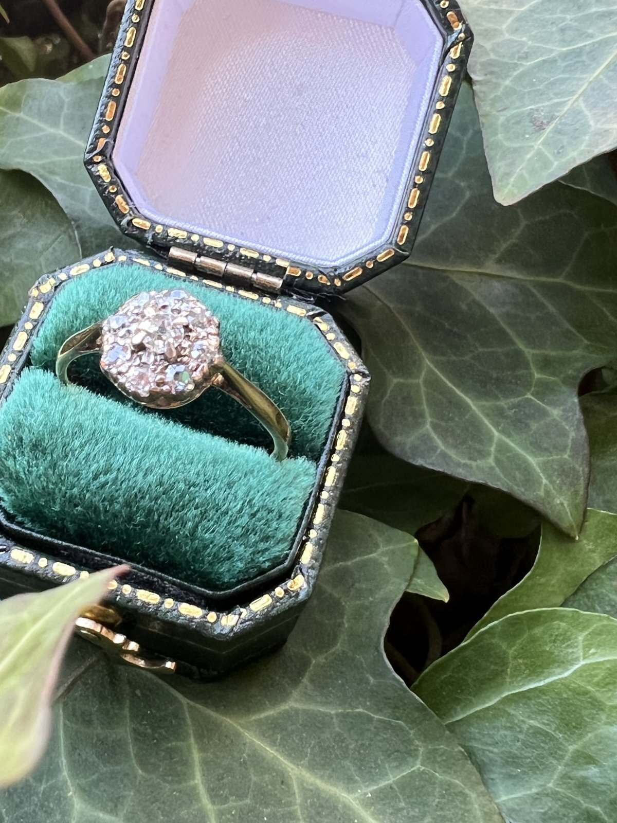 ダイヤモンドを集めて一つのお花のようにしたデザインをイギリスではよく「クラスターリング」と呼びます。可愛らしい印象と、ダイヤモンドが集まったゴージャス感があり、年齢問わずにずっとお使いいただけるデザイン。