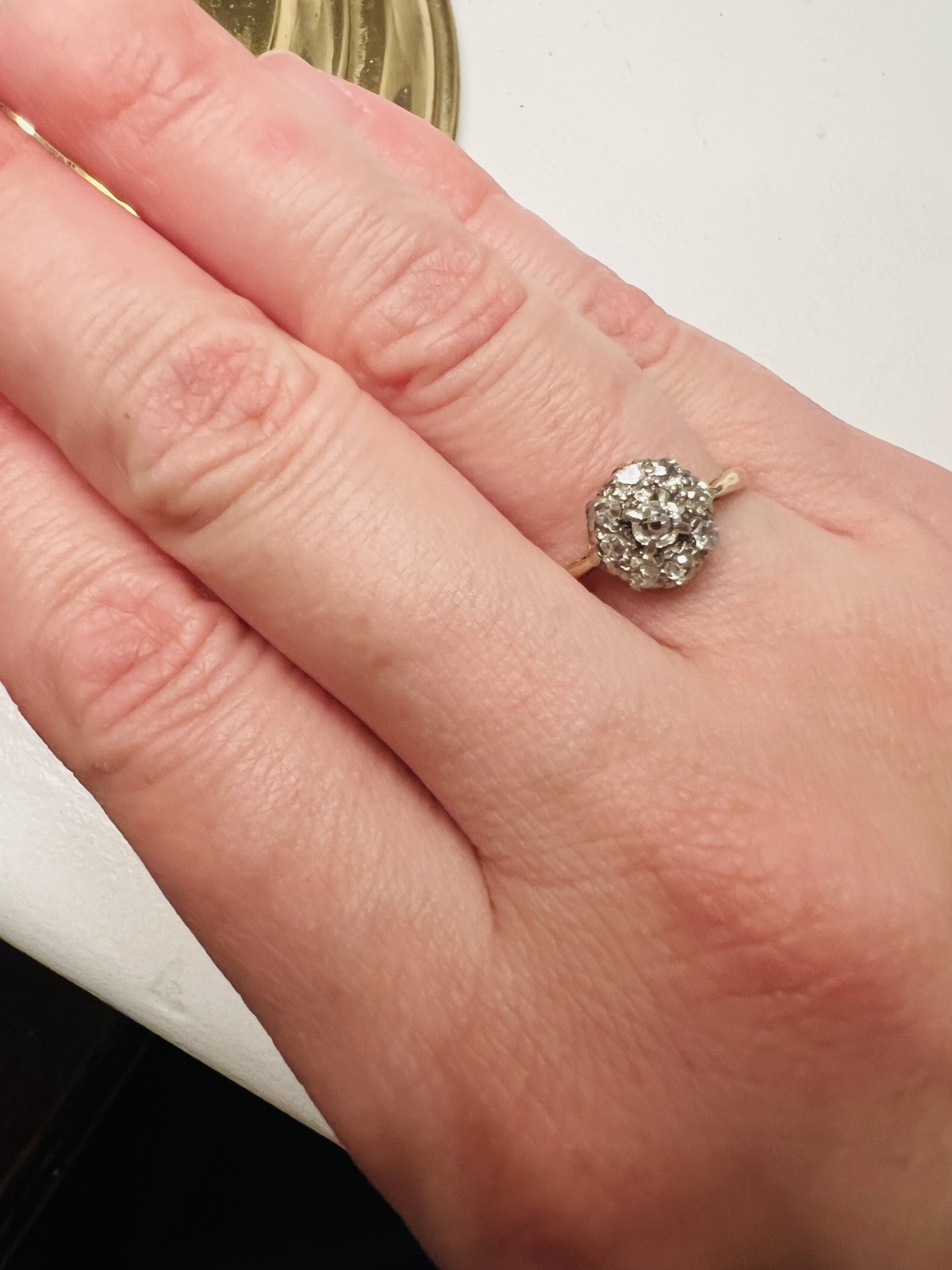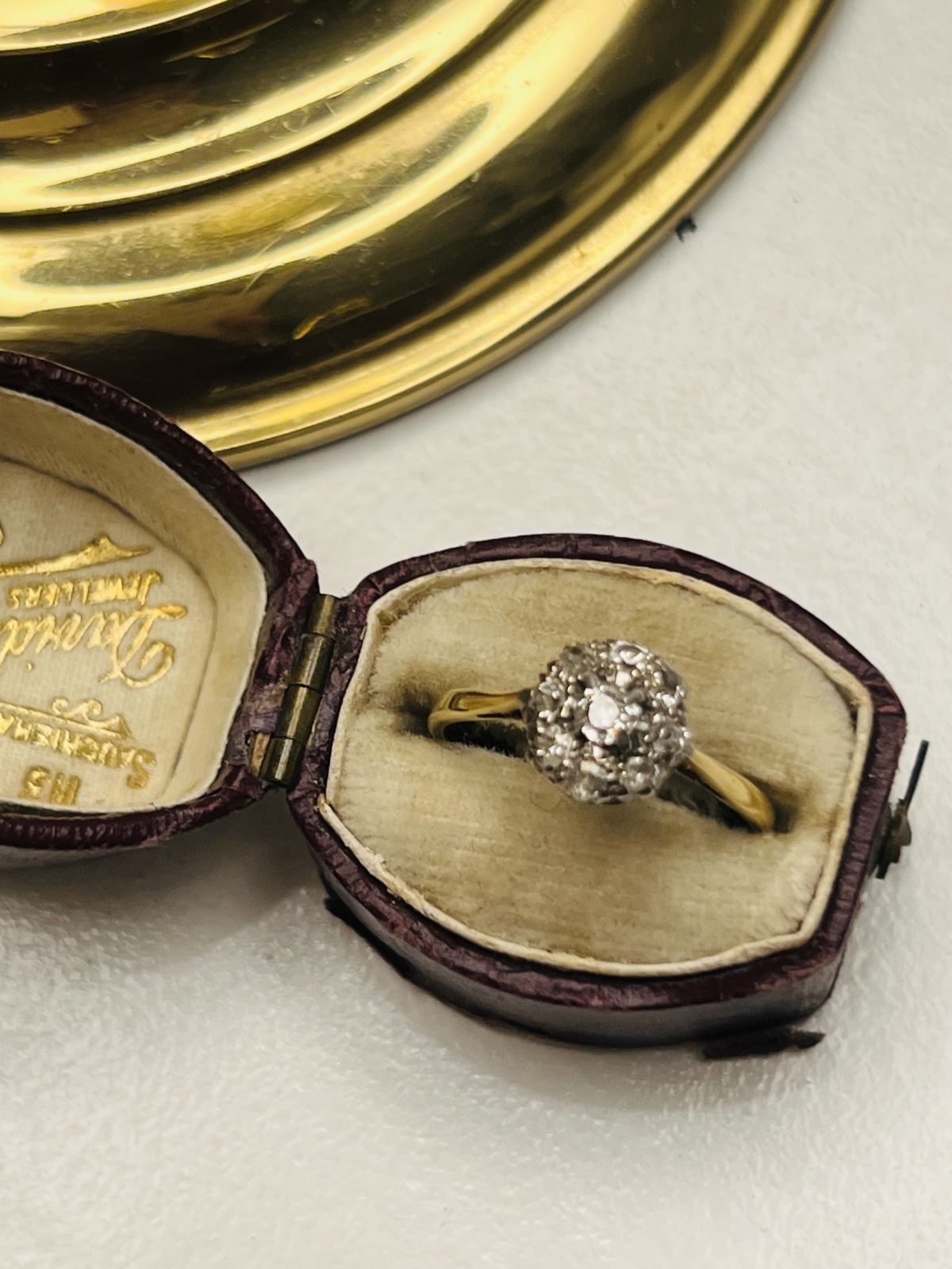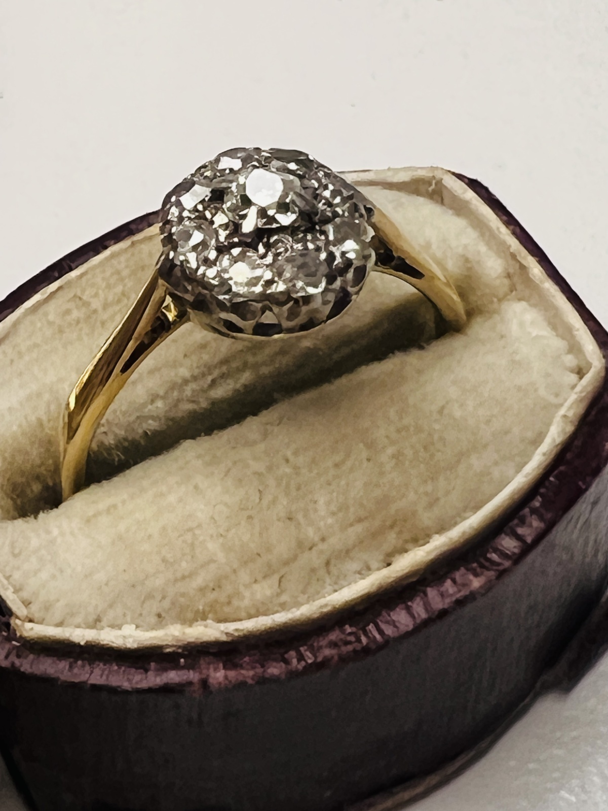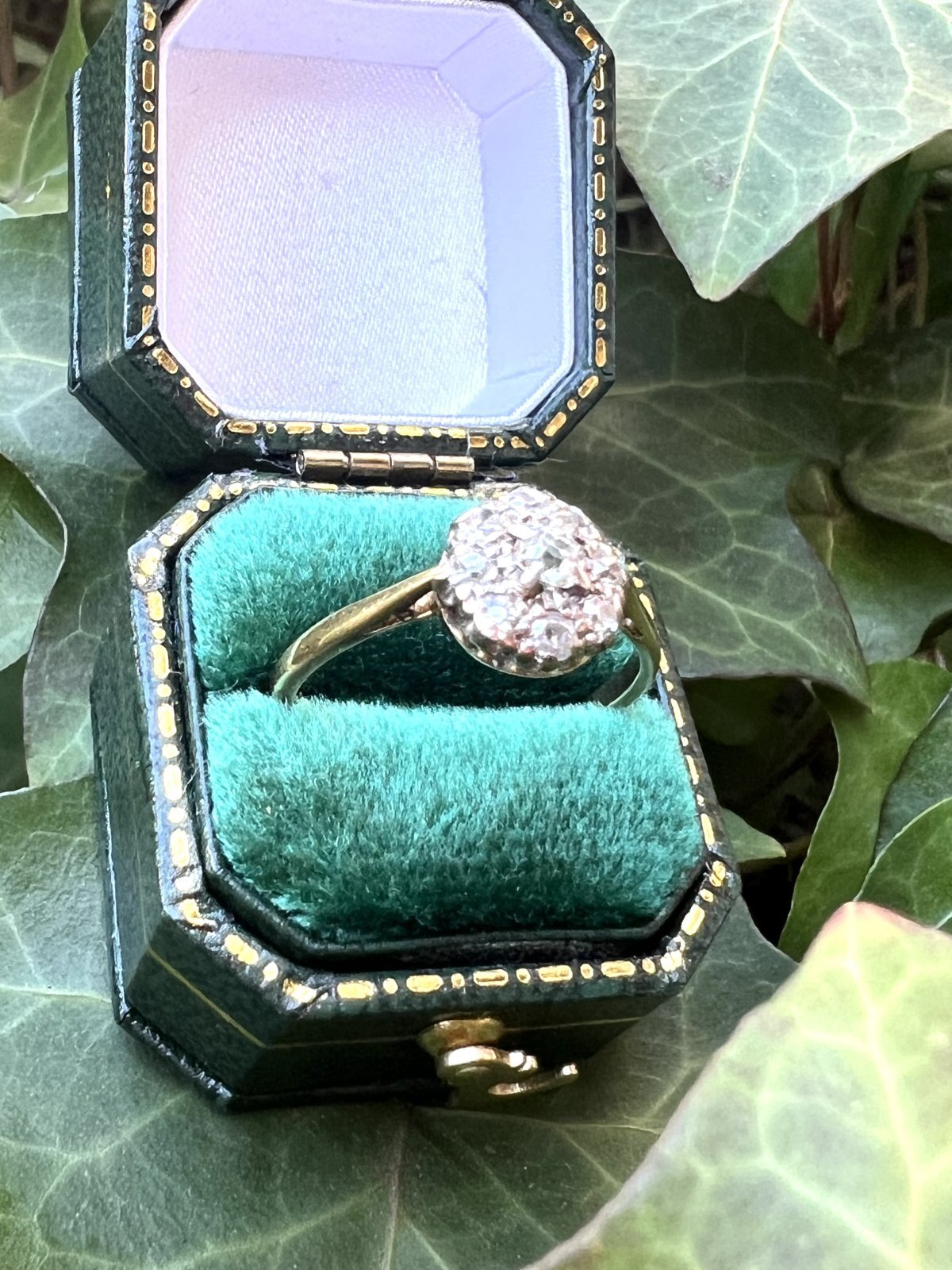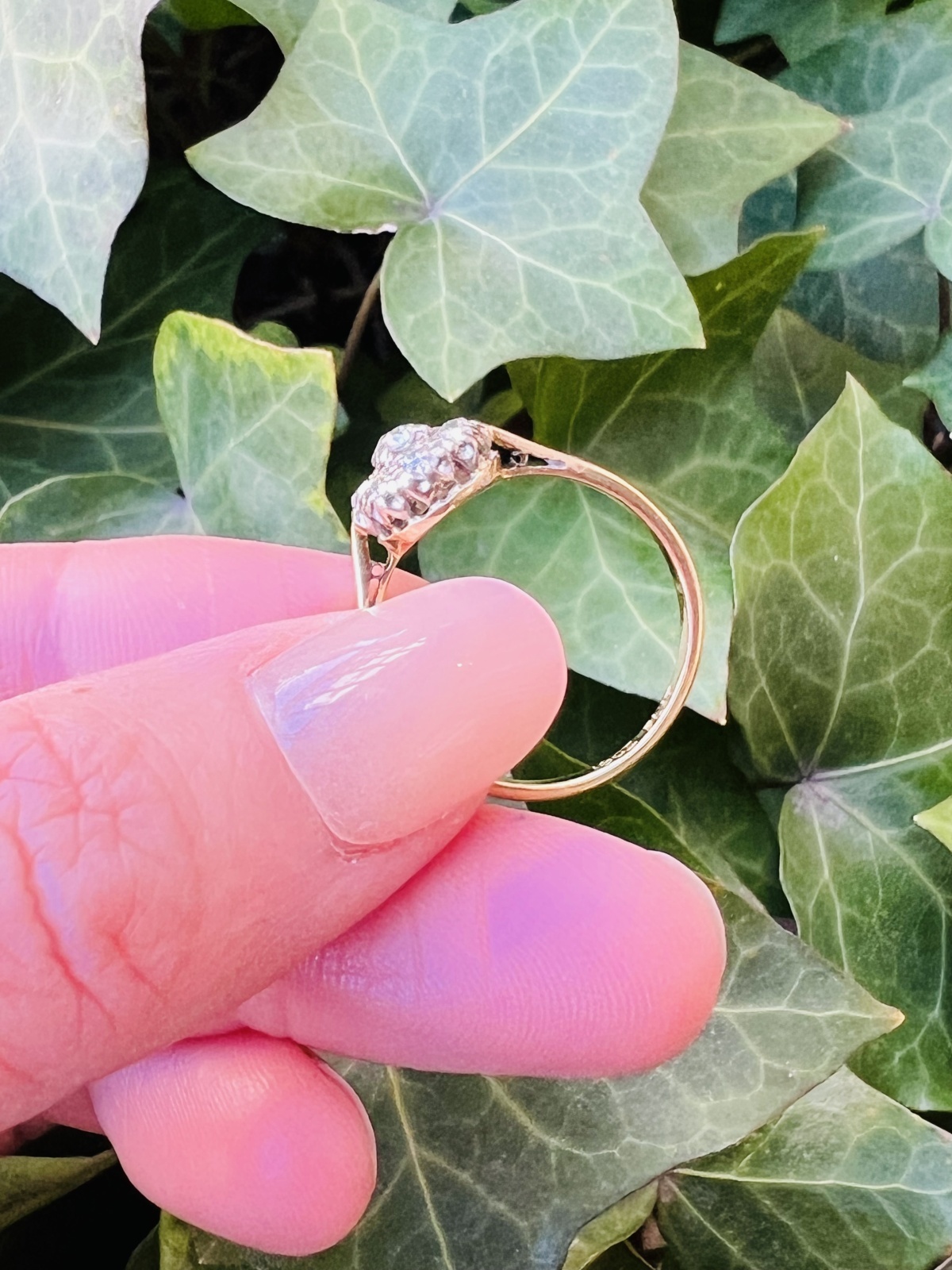 ダイヤモンドを集めて一つのお花のようにしたデザインをイギリスではよく「クラスターリング」と呼びます。可愛らしい印象と、ダイヤモンドが集まったゴージャス感があり、年齢問わずにずっとお使いいただけるデザイン。