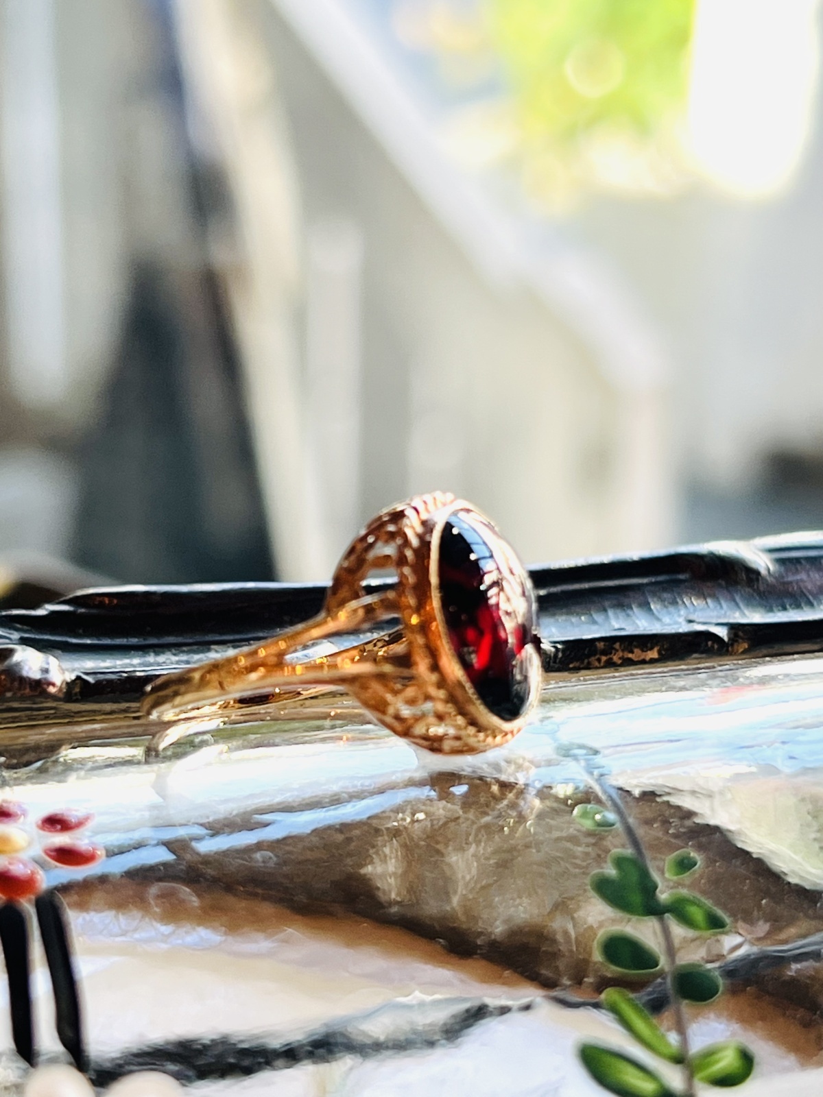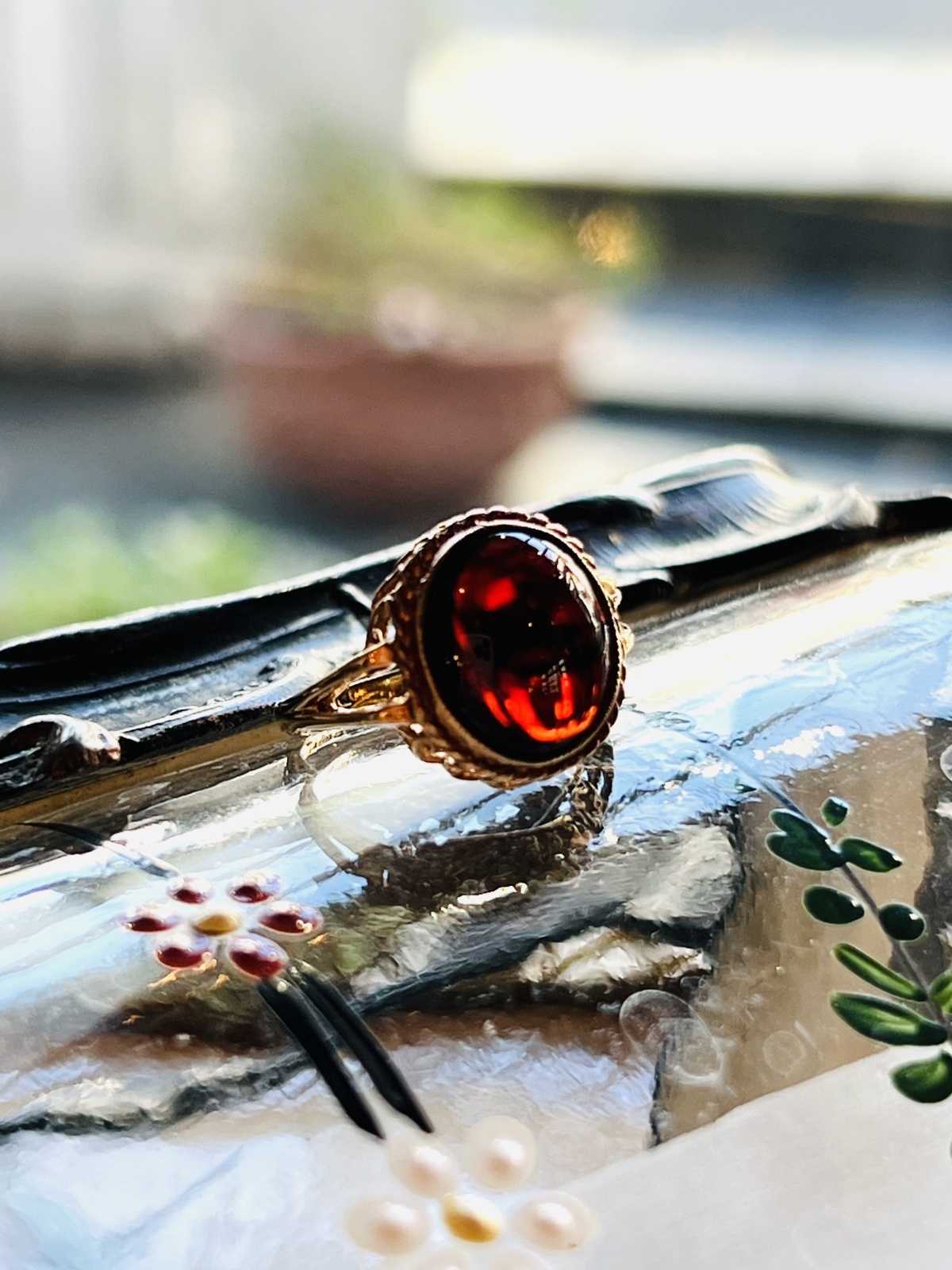 大きなガーネットのカボションが一つだけという、シンプルで潔いリング。シンプルなガーネットを囲んでいる、綱を編んだような美しい装飾、覆輪留めの上にはミルグレイン。サイドから見た時には網がすかしの様に見えて、味わい深いリングです。はめてみるととても知的な感じがし、カボションの中で動く光がくるくると色を変えて動き綺麗です。
