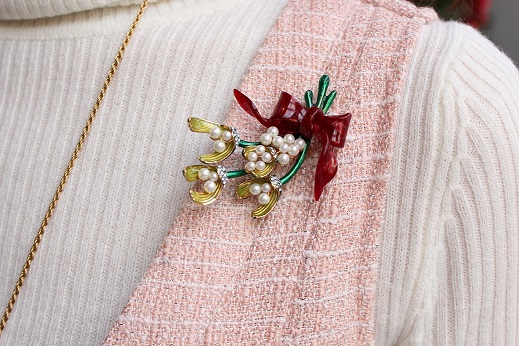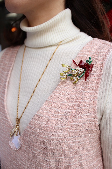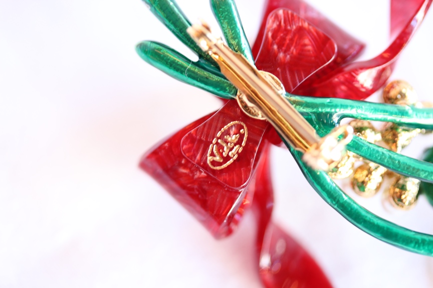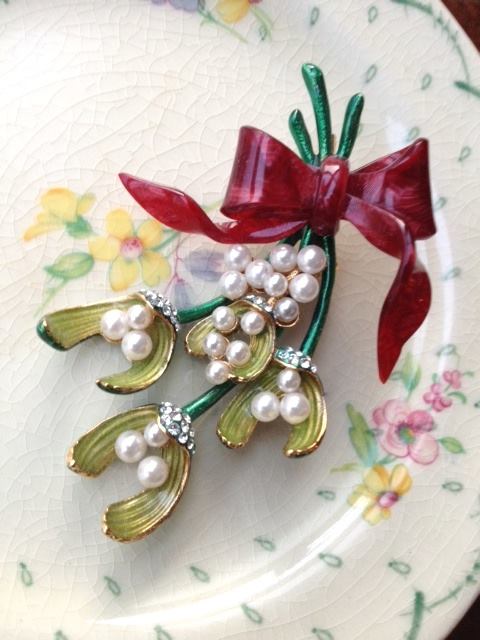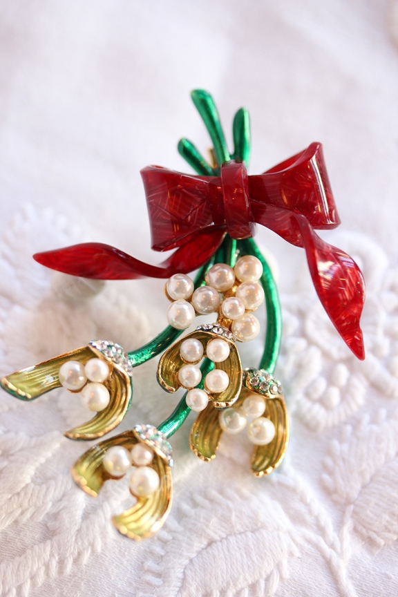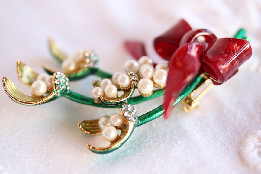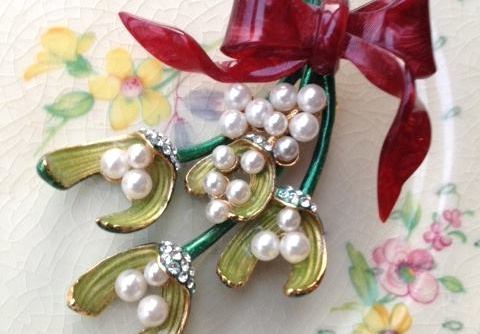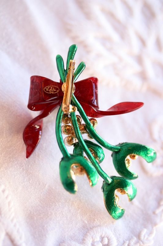 艶のある淡いグリーンのエナメルの花びらにグラスパールの実を付け、ラインストーンで光を添えたジュエリーの宿り木。