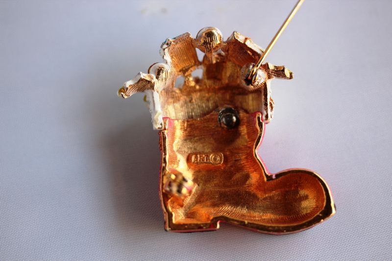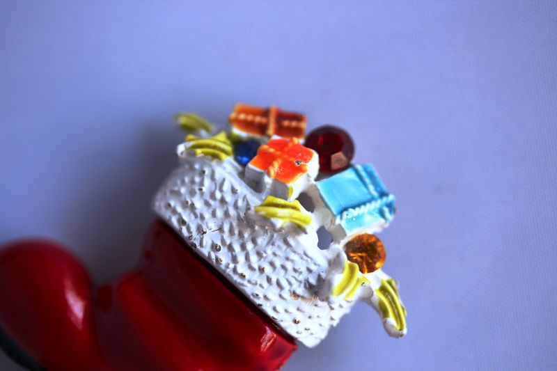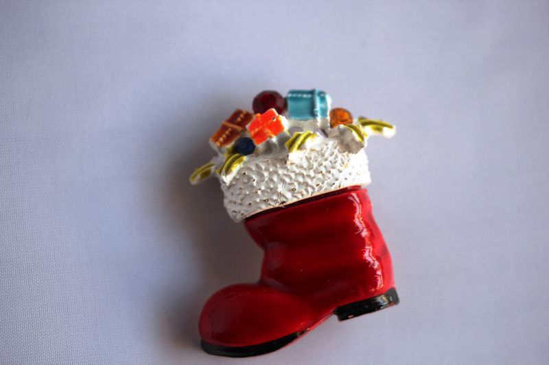 クリスマスブローチに定評のあるアート社のリースのブローチ。小ぶりながら、真っ赤なブーツが装いを一気にクリスマスにしてくれます。ブーツから溢れ出るカラフルなプレゼントには、ラインストンが忍ばせてあり、時折キラッと光るところが素敵です。